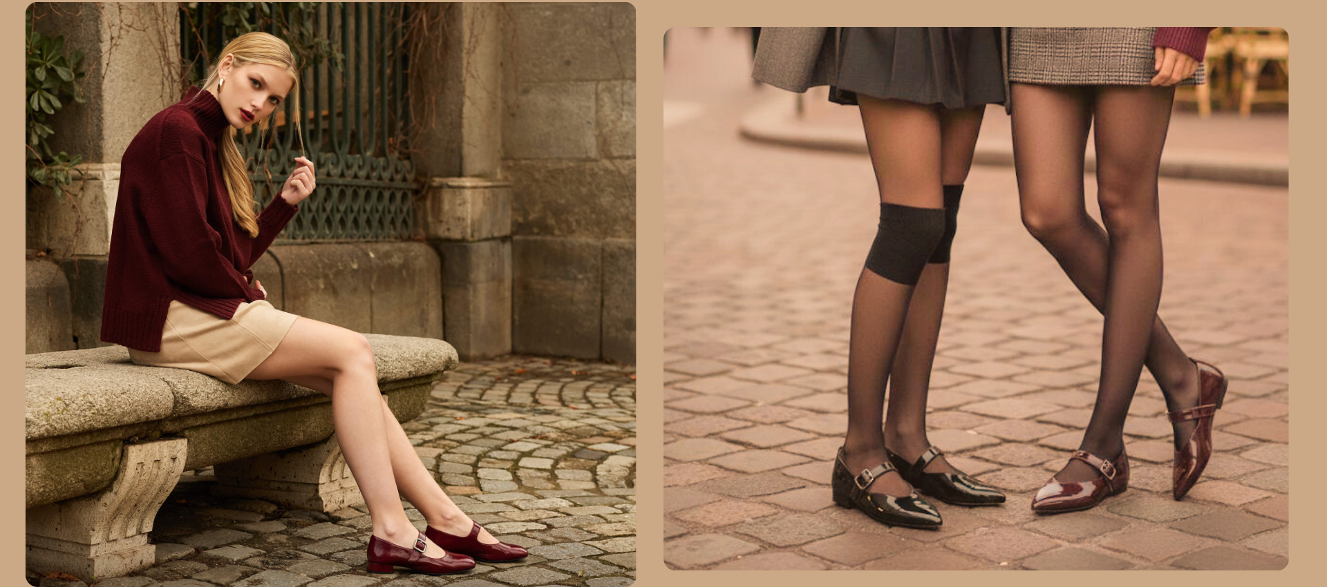 LATINO_ NTO ARENA_BLK Ballerines à pointe carrée en cuir beige. Détail de pointe et talon en cuir noir contrasté. Bride en cuir sur le cou-de-pied avec boucle en métal. Talon large de 5,5 cm de haut. Semelle en caoutchouc légère, flexible et antidérapante. Le meilleur choix pour cet hiver.