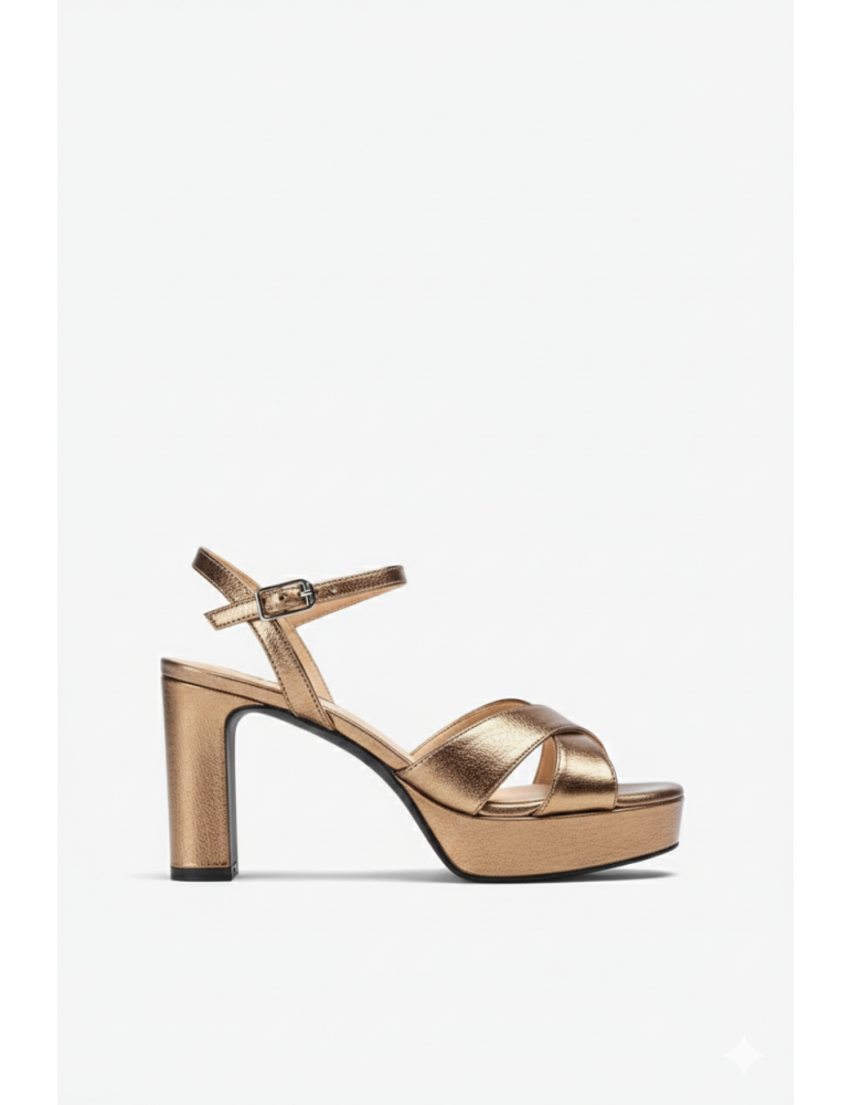 Sandales à pointe ronde fabriquées en metal metallisé, à brides croisées et réglables à la cheville avec boucle en métal. Talons de 8,5 cm et semelle compensée doublés ton sur ton Semelle extérieure en caoutchouc légère et antidérapante.