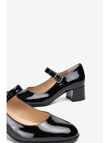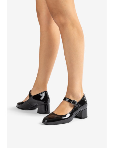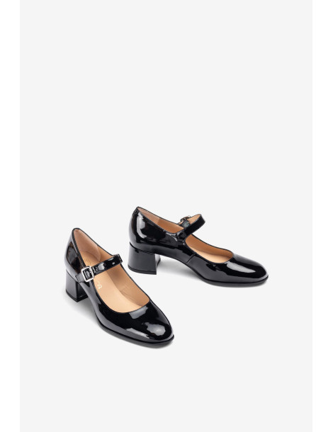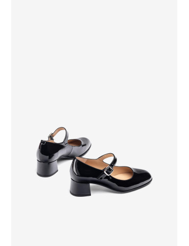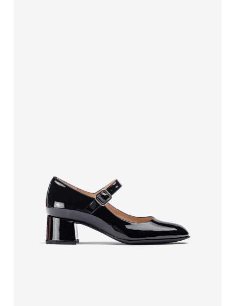 JUNDE_PA BLACK Babies à bout pointu en cuir verni. Bride à boucle sur l'empeigne. Talon large et confortable de 4,5 cm de haut, recouvert de cuir verni ton sur ton. Semelle en caoutchouc légère, souple et antidérapante. L'essence même d'Unisa à l'état pur.