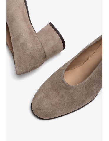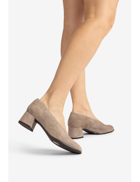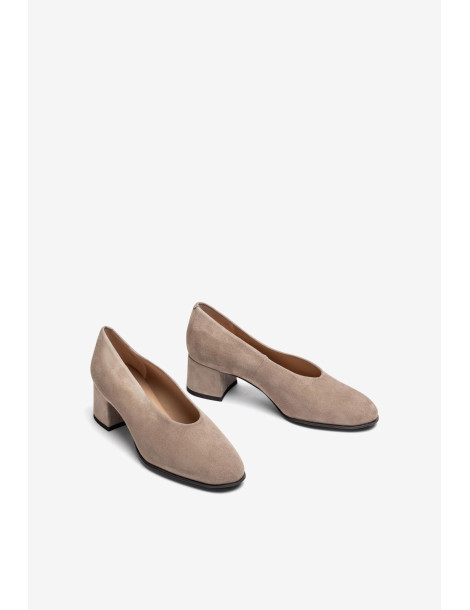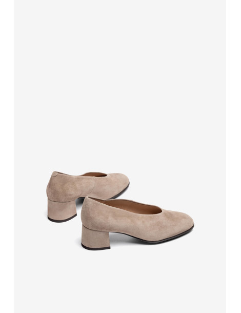 Escarpins à pointe ronde fabriqués en daim. Larges talons confortables de 5 cm doublés en ton sur ton. Semelle extérieure en caoutchouc légère, flexible et antidérapante. Classiques, confortables et féminins à parts égales.